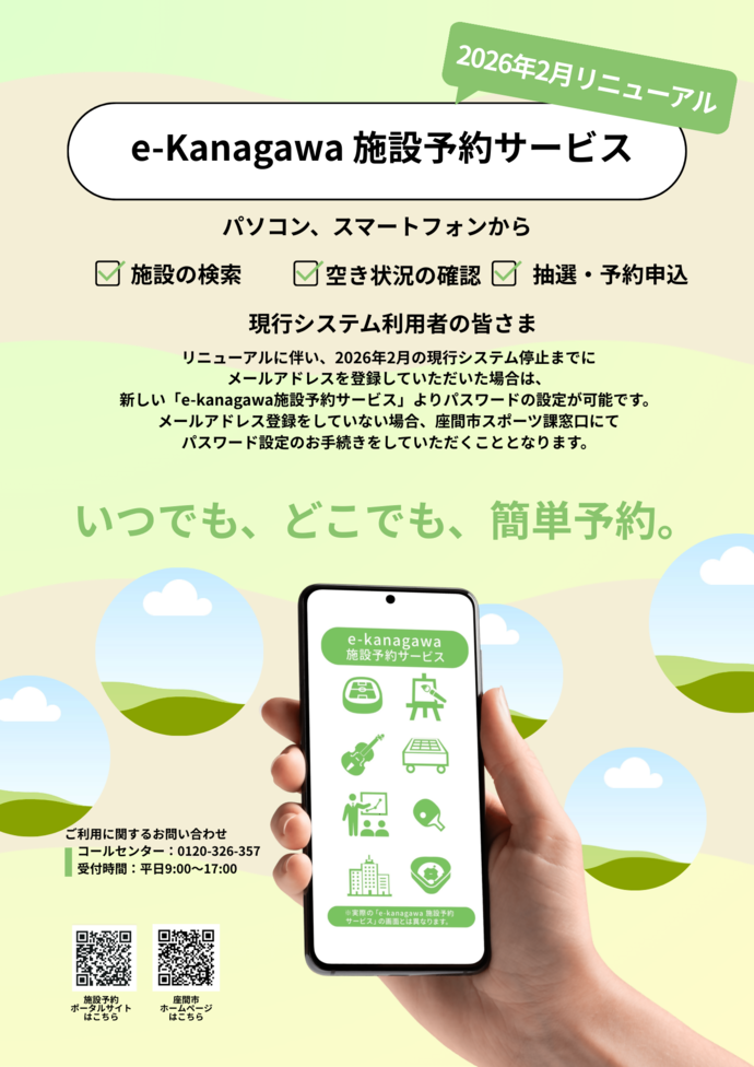 なお、データ移行に伴い令和8年2月17日~19日の間、現行のe-kanagawa施設予約システムは利用停止となります。