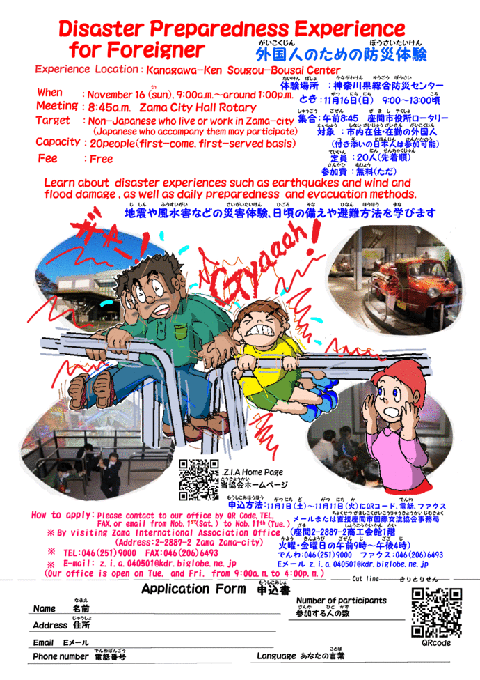 がいこくじん の ため に 神奈川県総合防災センター(かながわけん そうごう ぼうさい せんたー) で 「じしん」 や 「ふうすいがい(つよい かぜ や あめ の さいがい)」 など の さいがい の たいけん と 、「ひごろ の ぼうさい たいさく」 や 「ひなん の ほうほう」 を まなぶ いべんと を します。