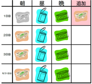 - もう1日分(3食分)余計に用意する(合計で12食分)。