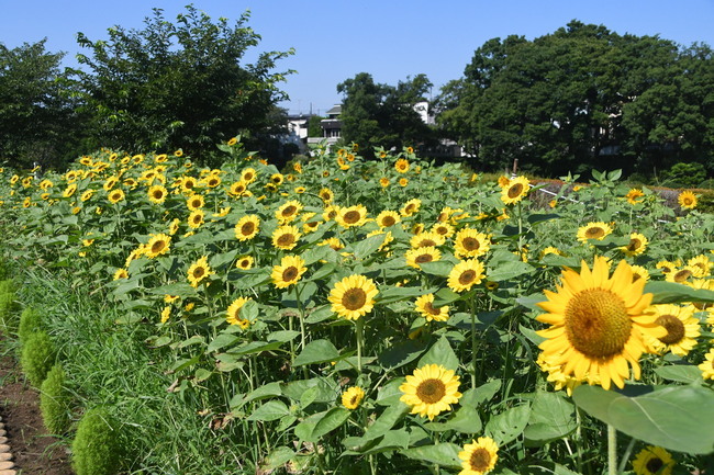 かにが沢公園(緑ケ丘4-23)で、約3,000本のヒマワリが開花し、訪れる方の目を楽しませています。
